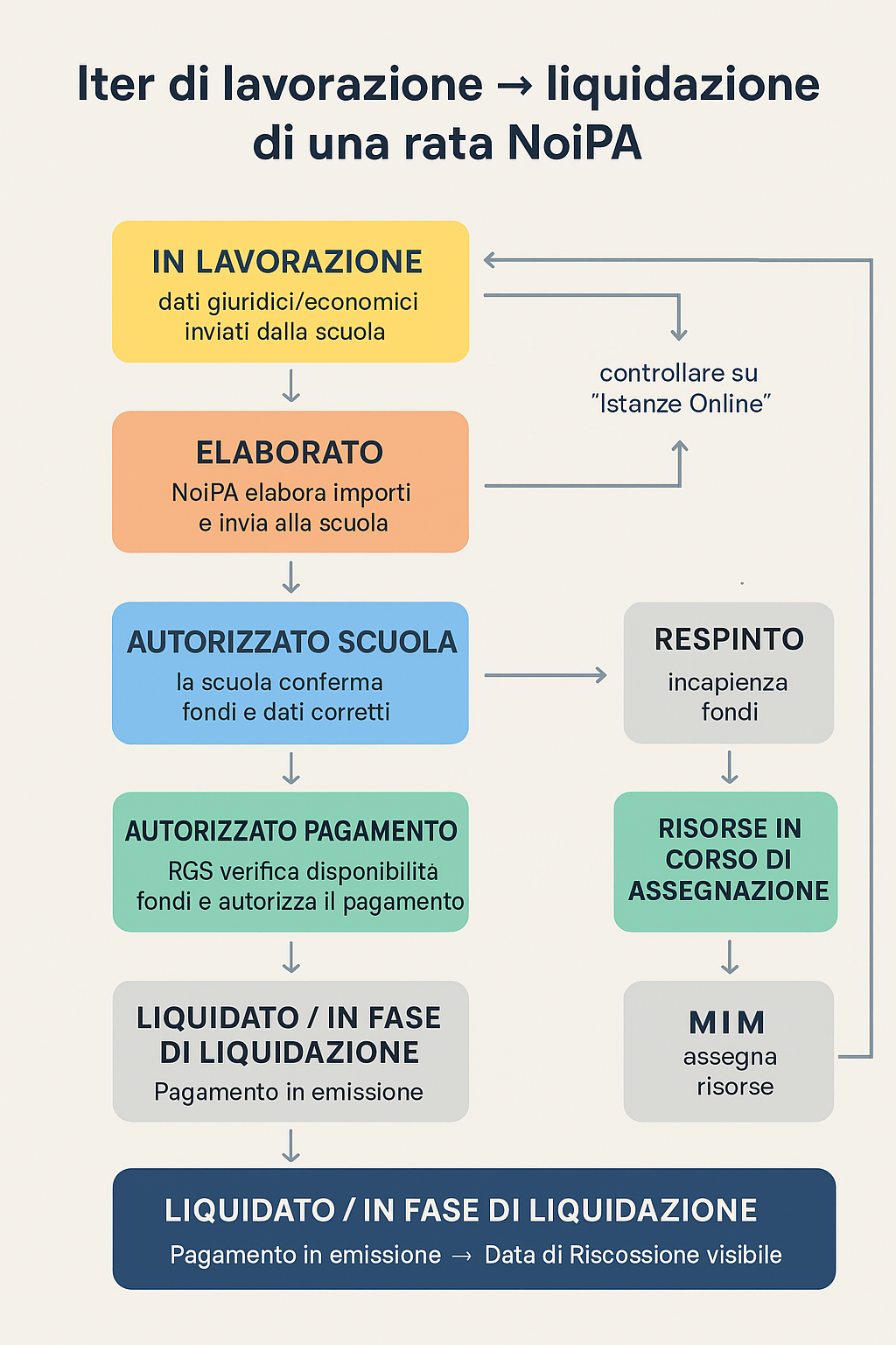 - ELABORATO: NoiPA ha trasformato i dati giuridici in economici e li ha rimandati alla scuola per verifica e fondi. Consigliato un controllo su Istanze Online per verificare l'iter autorizzativo lato scuola.